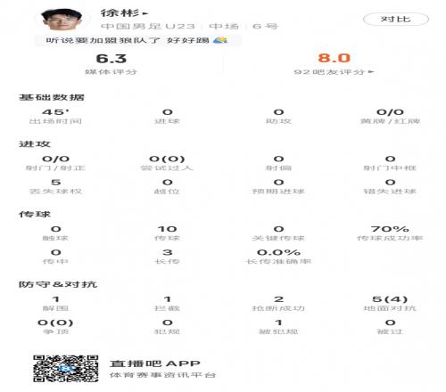 上半場U23國足隊長徐彬疲于防守,10次傳球,70%傳球成功率。1次解圍1次攔截2次搶斷,5次地面對抗4次成功。