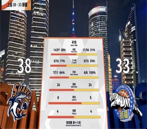隨后大鯊魚外援古德溫開始發力,大號三分命中吹響球隊反攻的號角,古德溫這一節4投全中,獨砍11分。在他的帶領下,上海男籃打出一個11比0,反超比分。而新疆男籃第二節19次出手僅僅投進5球。大鯊魚單節打出25比16,在半場結束時以38比33領先5分。