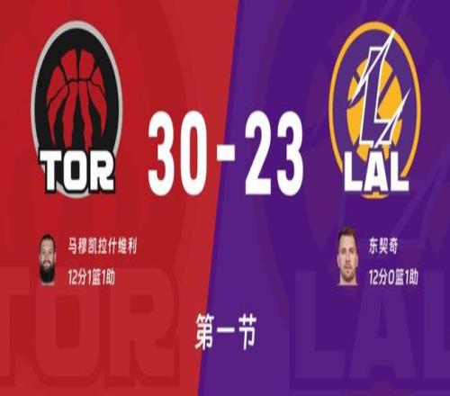 比賽開始湖人主場第一攻,東契奇三分嘗試打鐵,巴恩斯拿下籃板快下助攻博伊爾斯空接暴扣,斯瑪特運過來中距離跳投得分,艾頓內線單打也有湖人4-2開局。雙方攻防轉換很快,不過失誤都很多,三個回合誰也無法得分。博伊爾斯,英格拉姆接連內線得分猛龍反超2分,東契奇單打阿巴基兩罰全中比分打成6-6平。巴恩斯頂投艾頓得分,詹姆斯傳球失誤,博伊爾斯反擊頂翻東契奇打成,裁判給了進攻犯規,猛龍隨即暫停挑戰?;乜催^后挑戰成功了,改成東契奇阻擋博伊爾斯加罰命中11-6猛龍領先5分,東契奇上籃接連被帽拉拉維亞三分三不沾,巴恩斯中距離拔中,東契奇抱怨裁判吃到技術犯規英格拉姆技術罰球命中14-6。詹姆斯跳投止血,巴恩斯上下步回應猛龍,馬穆爆發連得12分東契奇對彪砍下8分湖人還是落后7分,暫?;貋黼p方各得2分,這樣首節打完湖人23-30落后7分!