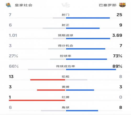 在場面上看,巴薩對陣皇社射門數為25-7,控球率巴薩高達73%,預期進球數巴薩更是接近4球,但最終只打進1球,1-2負于皇社,西甲賽場的9連勝被皇社終結。