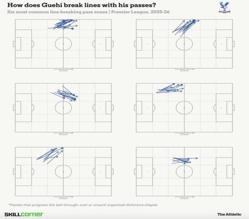 在水晶宮,格伊經常出現在三中衛體系中的左中衛位置。他的很多向前傳球,都會分到邊路,讓米切爾在翼衛位置上拉開空間。不過,隨著他在面對陣地防守時獲得更多觸球機會,我們已經看到他在“穿透性向前傳球”方面具備進一步提升的潛力——他完全有能力用雙腳在中路關鍵區域找到隊友。