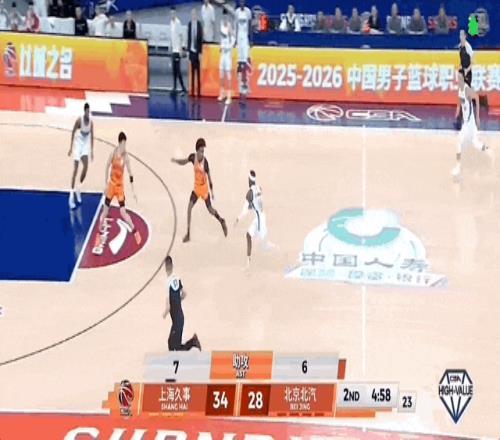 杰曼面對劉禮嘉,從左路突進,將球塞給塔瑞克,后者躍起擦板得分。古德溫帶球,分劉禮嘉后回傳到自己手上,正面拔起三分不進。杰曼拿到籃板,一條龍直沖籃下,拉桿再進!北京隊將比分逼近到30-34,上海隊叫停比賽。