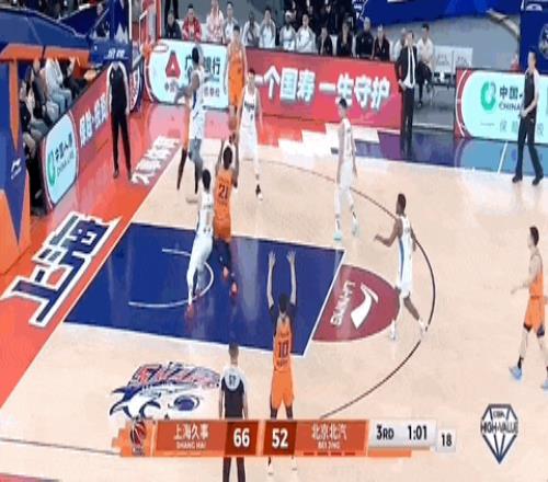 暫停回來,李弘權三分不進,馬蒂昂搶到籃板,交給杰曼推進,右側弧頂陳盈駿假投真傳,馬蒂昂籃下吃餅,北京隊僅落后一分,上海隊再喊暫停。