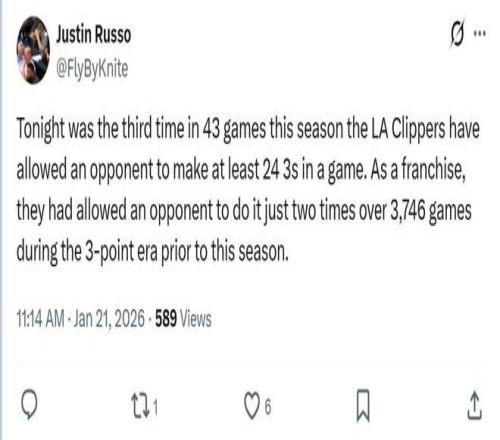 這也是本賽季快船隊的最大短板之一,本場讓公牛隊命中創隊史紀錄的25記三分,是開季快船隊43場以來第三次單場讓對手命中至少24記三分,隊史此前3746場比賽僅出現2次。