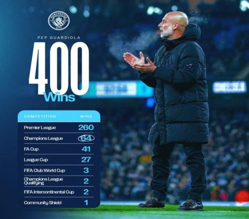 瓜帥執教曼城400勝分布:其中英超260場,歐冠64場,足總杯41場