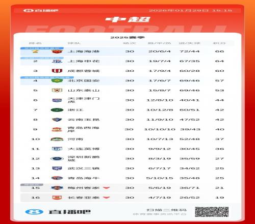 如果足協罰分在2025賽季執行,中超積分榜前六