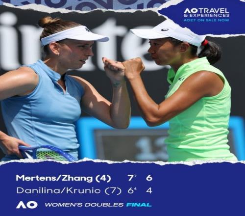 2026年澳網女雙決賽,4號種子張帥/梅爾滕斯7比6(4) 6比4擊敗7號種子達尼麗娜/克魯尼奇。這是張帥/梅爾滕斯搭檔第一次贏得大滿貫冠軍,也是37歲張帥摘得的第三座大滿貫雙打冠軍!她們將獲得81萬澳元(折合人民幣約392萬元)冠軍獎金。首盤比賽,張帥組合在1比4落后情況下,連贏4局,最終通過搶七以7比6(4)拿下第一盤。第二盤,張帥組合在5比0領先的情況下,兩次錯失冠軍點,被對手追成5比4,最終張帥組合在第三個發球勝賽局勝出。張帥繼2019年澳網搭檔斯托瑟收獲生涯大滿貫首冠后,再度斬獲澳網女雙冠軍。
