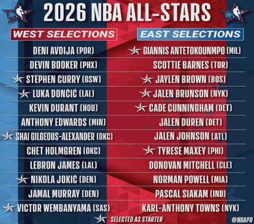 北京時間2月2日上午,NBA公布2026全明星替補陣容,由30支球隊主教練投票選出。東部:米切爾(騎士)、鮑威爾(熱火)、杰倫-約翰遜(老鷹)、西亞卡姆(步行者)、巴恩斯(猛龍)、唐斯(尼克斯)、杜倫(活塞)。
