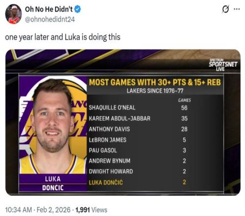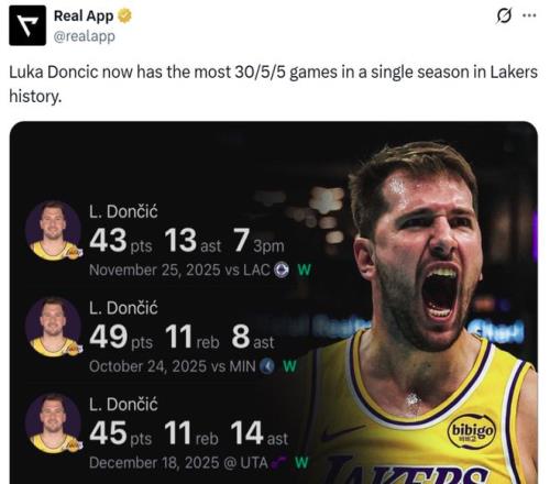 同時這是東契奇本賽季第27次單場交出至少30+5+5,超越65-66賽季的杰里-韋斯特創造新的湖人隊史紀錄。