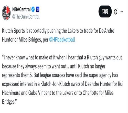 Hardwood Paroxysm寫道:“每次聽到Klutch旗下的球員想要離隊,我都不知道該作何感想——他們似乎總嚷嚷著要走……可直到Klutch不再代理他們的合約,這種聲音就消失了。不過據聯盟消息源透露,這家頂級經紀公司已表達了交易意向,希望促成一筆‘Klutch內部球員互換’:要么將德安德烈-亨特送至湖人,換取八村塁和加布-文森特;要么用同樣的籌碼,向夏洛特黃蜂隊交易邁爾斯-布里奇斯?!?/p>